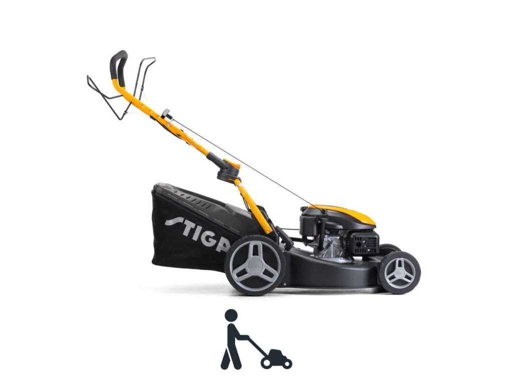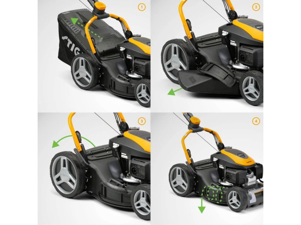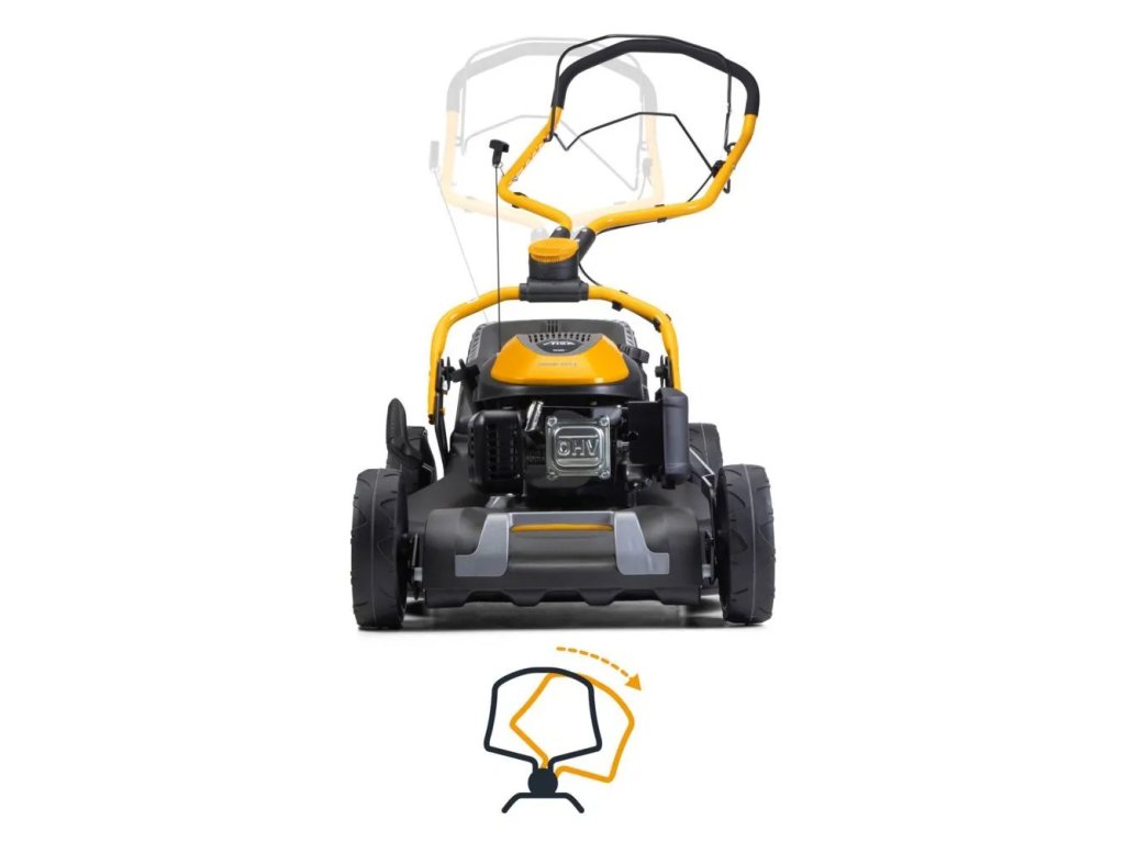 Rukojeti s měkkým povrchem a nastavitelné madlo zajišťují přirozenou a pohodlnou pracovní polohu při sečení. Intuitivní, snadno dostupné ovládací prvky, včetně variátoru rychlosti, umožňují jednoduchou obsluhu, zatímco pojezd a velká zadní kola zaručují plynulou manévrovatelnost na všech typech terénu. Rychle sklopné madlo umožňuje rychlé, kompaktní a prostorově úsporné skladování