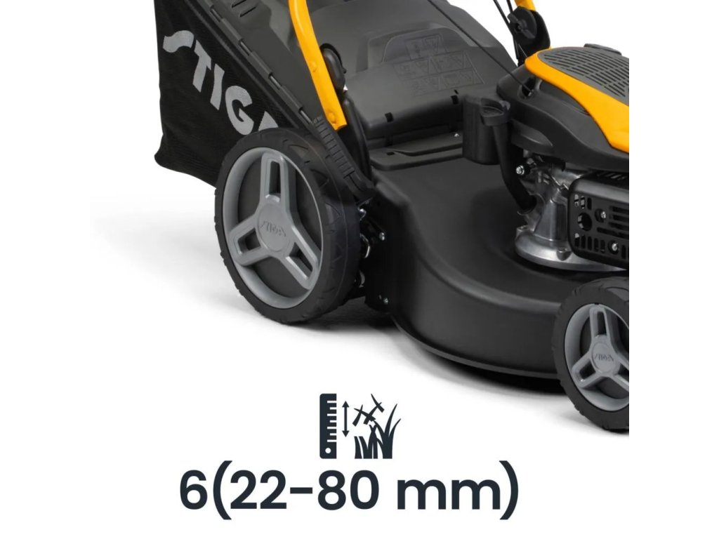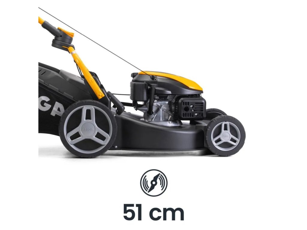 51cm ocelové žací ústrojí se šesti nastavitelnými výškami sečení (22–80 mm) a 3v1 systémem sečení – sběr trávy, mulčování a zadní výhoz – zajišťuje všestrannou a přesnou péči o trávník