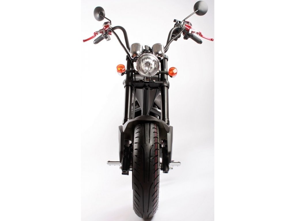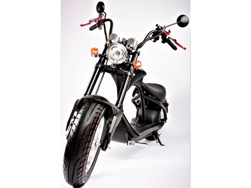 Koloběžka ECO HIGHWAY v designu SUPER CHOPPER je vybavena baterií Lithium-ion 60V 20Ah. Elektromotor Boshel 2000W zaručuje čistý a naprosto tichý ekologický pohon s rychlostí až 72 km/h a dojezdem až 60 km. Širokoplášťové zadní kolo 215/40 12" s výborným odvodem vody a nízkou hlučností se stará o perfektní stabilitu. Velká kola a špičkové tlumiče kvalitně absorbují nerovnosti na cestách, ať už se jedná o silnici či polní cestu. Funkční robustní konstrukce s nosností až 200 kg nabízí možnost vozit i dárečky nebo kamarády. Síla motoru si poradí s kopcem do stoupání 20%. Součástí koloběžky je také alarm na dálkové ovládání. O odpružení zadního kola se stará speciální silent blok v uchycení kola k rámu, přední část je vyřešena klasickou vidlicí s dvěma tlumiči. Zadní a přední blinkry, brzdové světlo, zadní světlo indikující rozsvícení předních světel, přední halogenové světlo s přepínáním potkávacích, nebo dálkových světel určitě oceníte hned po první jízdě. Luxusní vzhled podtrhává kvalitní módní sedačka, zadní blatník s vystouplým brzdovým světlem a u tohoto modelu také velmi pohodlné opěrky nohou pod řídítky jako je u chopperů zvykem.